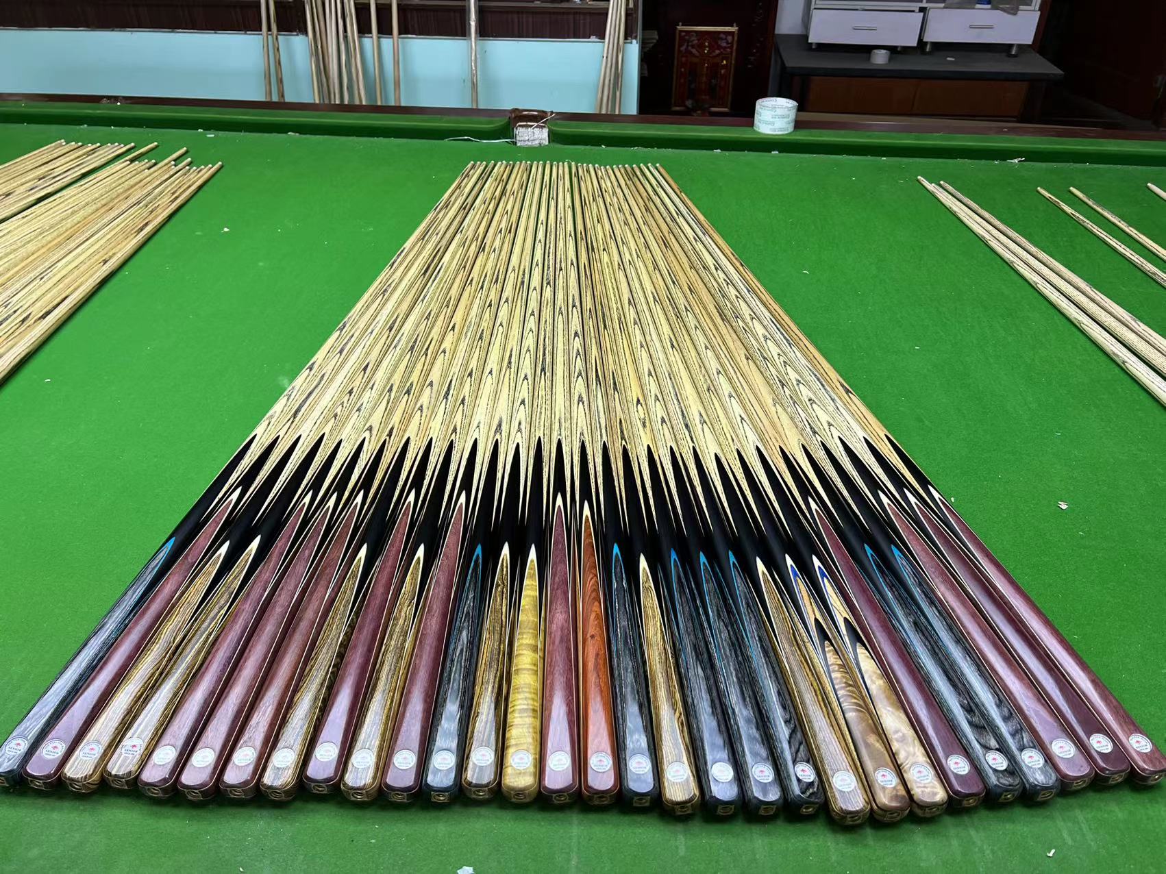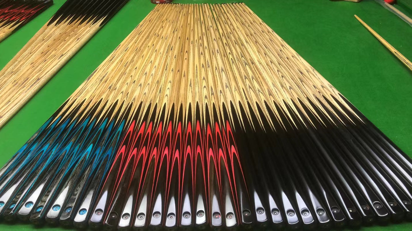 SNOOKER CUE SPECIFIC: 4A Canadian Ash. Length: 57inch, Weight: 17.5-18.5oz, Tip size: approx 9.5mm, 1 piece cue. Ash shaft. Hand spliced ebony butt. Exotic wood Splices. Good Balance. Mark Richard Black badges.