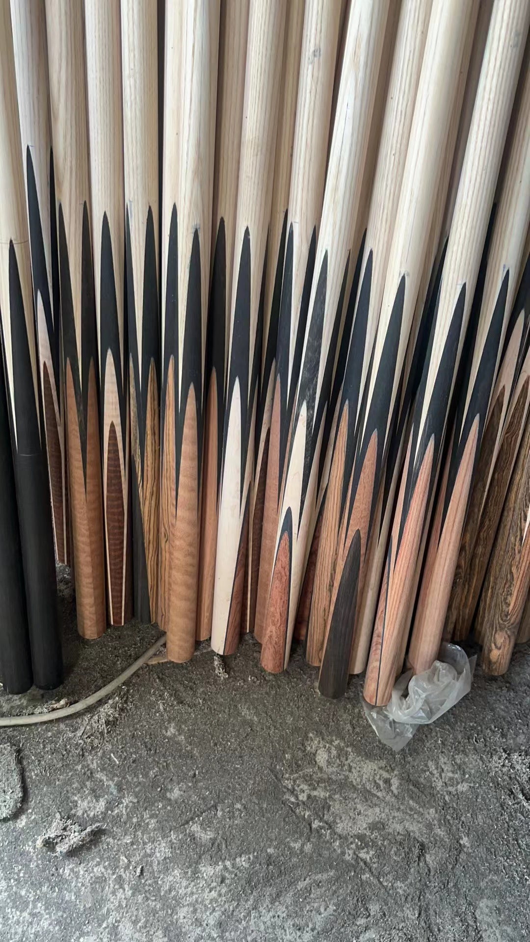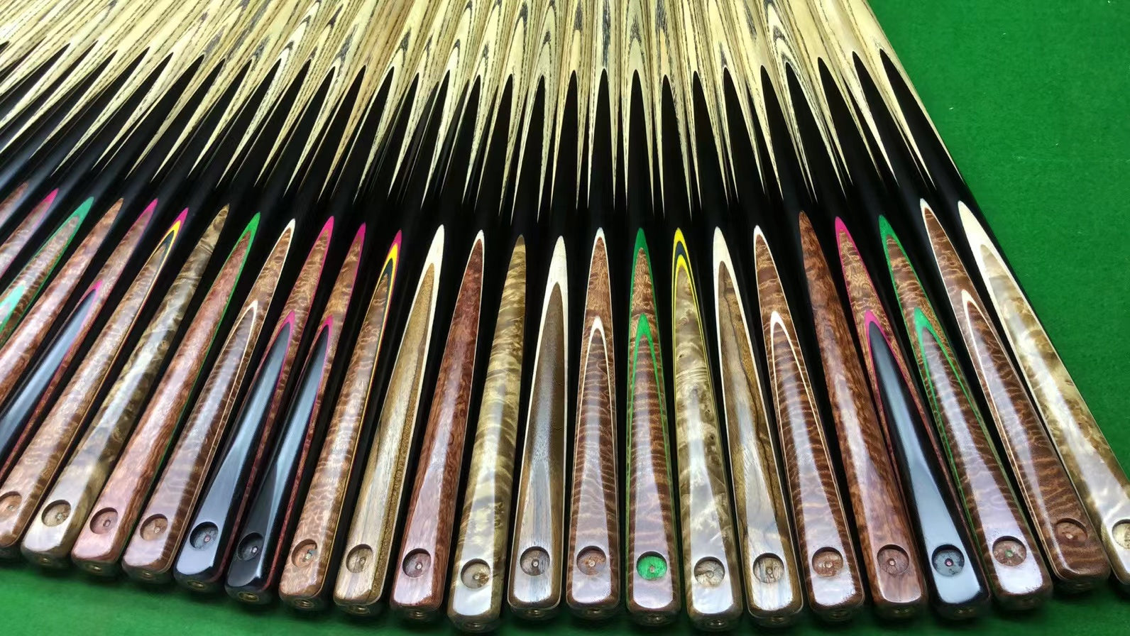 Its a manmade stable timber created using resins and dyes combined with muti-layers of wood pieces. Normally 100-layers on the butt and approx 15-layers on splicing. There is almost no chance of timber cracking.
